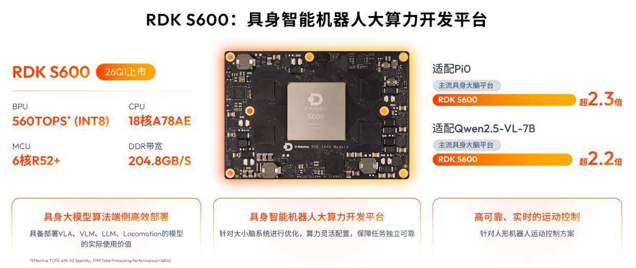 据了解,此次前瞻亮相的S600作为地瓜机器人的旗舰级具身智能机器人大算力开发平台,拥有560 TOPS*(INT8) 算力,采用高效灵活的大小脑架构设计并进行了深度优化。其大脑配置18核A78AE CPU和全新BPU Nash,可支持VLA、VLM、LLM、Locomotion多种具身大模型算法端侧高效部署,尤其是在适配Pi0、Qwen2.5-VL-7B时,性能分别超越主流具身大脑平台2.3倍和2.2倍,满足复杂决策需求;小脑配置6核R52+ MCU,专为人形机器人优化,具备高可靠、实时的运动控制能力。(*Effective TOPS with 1/2 Sparsity, TPP(Total Processing Performance)