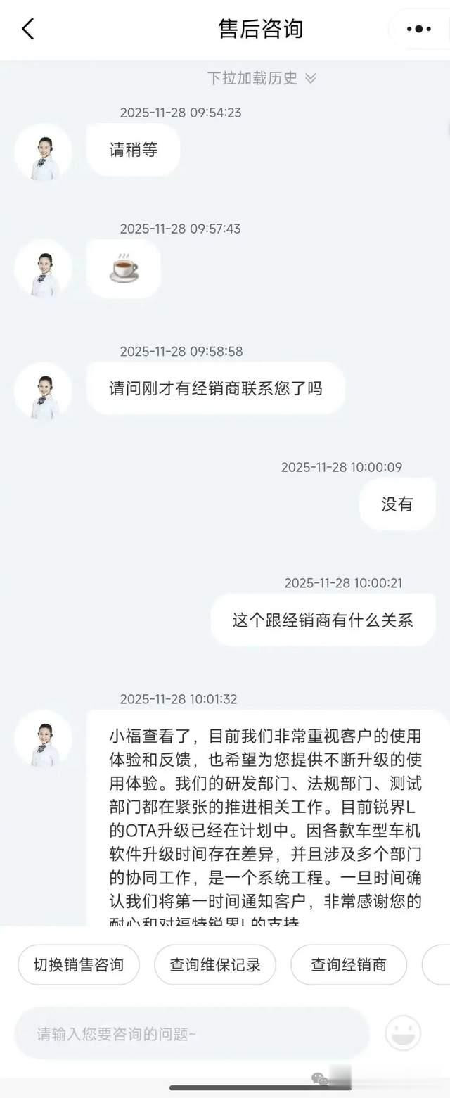 浙江省金华市的车主云飞扬(化名)则在一次次沟通中耗尽了耐心。他的2023款锐界L两驱豪华款购于2024年3月,购车时销售人员承诺的“OTA远程升级拓展应用”,成了他长期的期待。2025年11月28日,他再次联系厂家客服,得到的回应是:“研发、法规、测试部门都在推进相关工作,锐界L的OTA升级已在计划中,因涉及多部门协同,时间确定后会第一时间通知。”面对这番官方说辞,云飞扬忍不住发问:“车主们盼了这么久,到底什么时候是个头?”