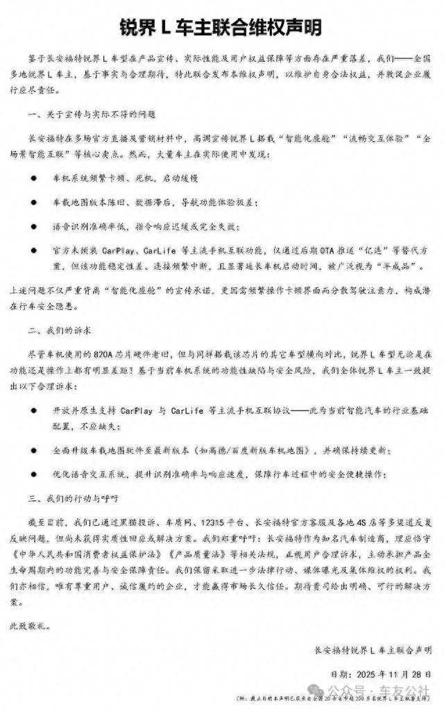 11月28日,长安福特锐界L车主发布集体维权声明,就车机问题导致行车过程的安全隐患,向长安福特品牌明确提出核心诉求。主要包括开放并原生支持 CarPlay 与 CarLife 等主流手机互联协议、全面升级车载地图软件至最新版本、优化语音交互系统等。