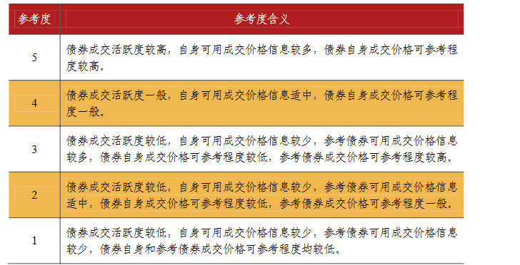 从附录给出的参考度含义来看,若债券成交活跃度较低,自身可用成交价格信息较少,参考债券可用成交价格信息也较少,那么在中债资信估值定价中对相关成交价格的参考程度就较低。