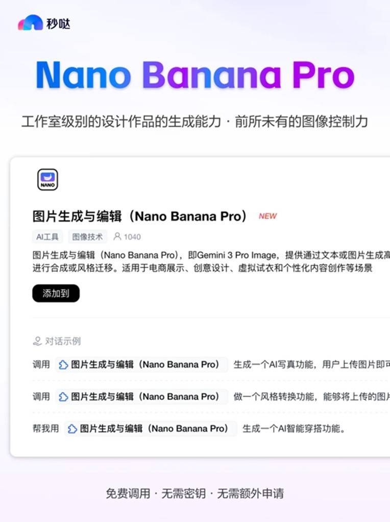 百度智能云旗下的无代码应用搭建平台百度秒哒,在模型发布当日即宣布完成 Nano Banana Pro 插件接入,成为国内首批支持该模型的无代码应用搭建平台。通过秒哒,用户可零成本、零门槛、无需 API 密钥、无需申请权限,直接在编辑界面 @Nano Banana Pro 即可立即调用,率先享受顶尖图像生成能力带来的创作体验。