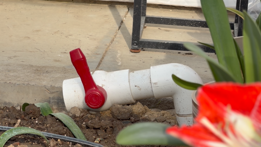 虹桥花谷的低碳花卉可持续种植示范基地大棚里,最显眼的不是排列整齐的反季节花卉,而是两个“庞然大物”——高2到3米、直径2米左右的储存罐。储存罐里装着废水,利用生物处理技术将废水变成水肥后,再通过棚顶均匀排列的智能喷淋系统,给花卉提供所需养分。