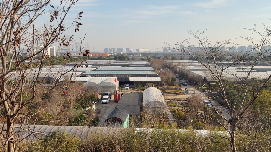 花市的尽头,有一座高约27米的小山。站在山顶,可以俯瞰虹桥花谷的全貌。山上现在还是一派萧瑟荒芜的景象,每当春季来临,这里就会摇身一变,成为一座“花山”。